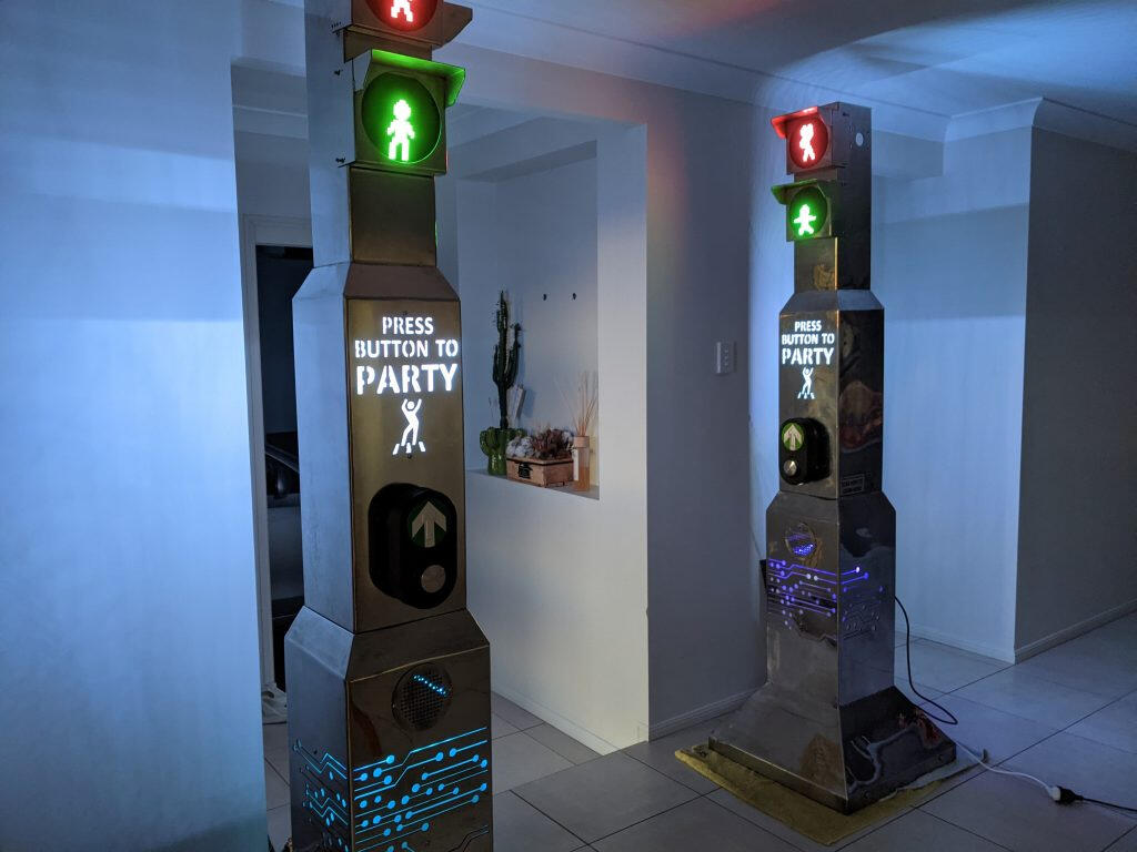 The Party Button is a collaborative artwork by Steph Piper, Joseph Burgess, Metal Art Madness, Kobe Ouano, and Larry Banks. It is designed to surprise and delight the public through creative crosswalk traffic interfaces. It was part of the Curiocity Brisbane 2021 Exhibition held in Brisbane, Australia. Learn more about the project here.